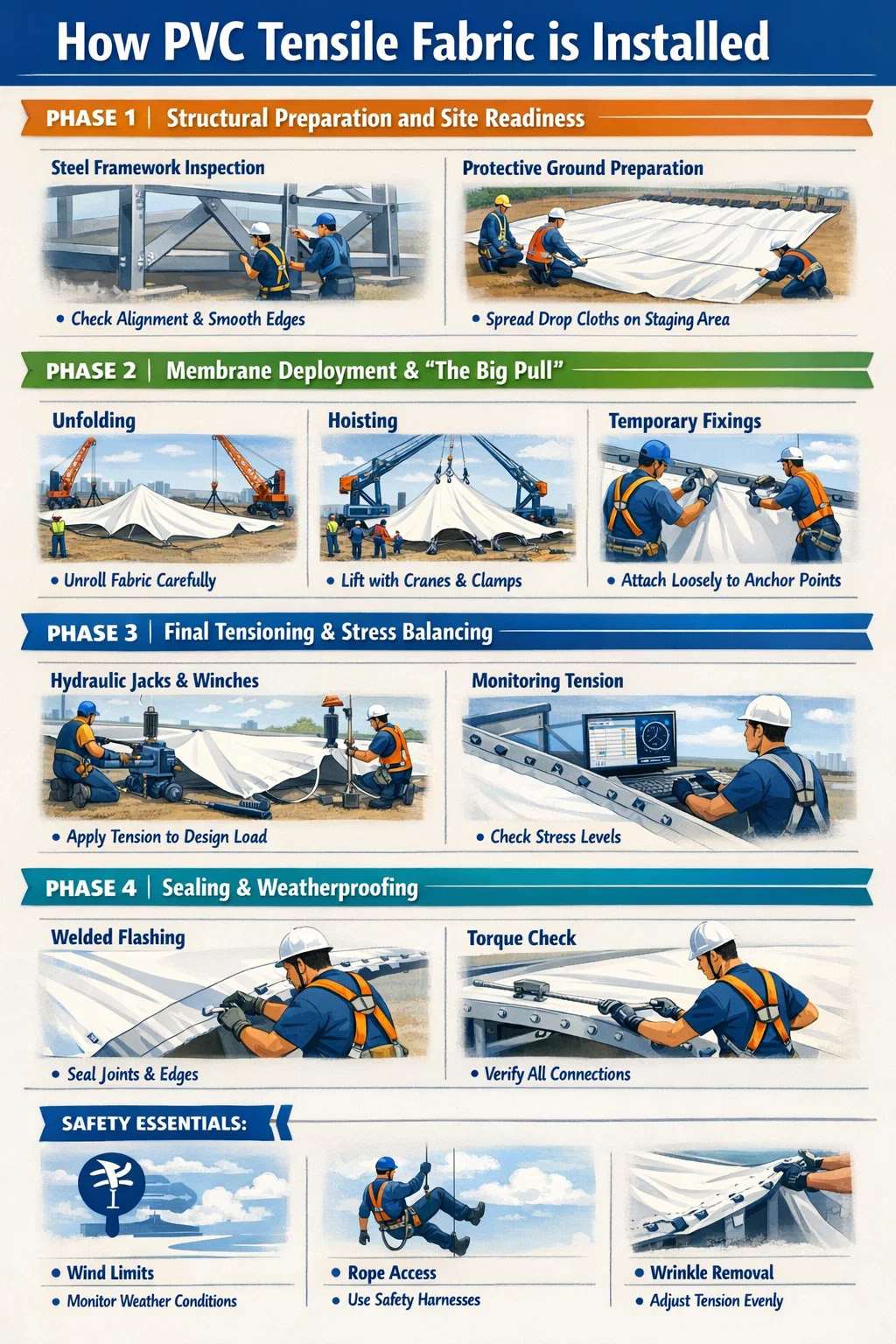 A Tejido extensible de PVC La estructura sólo es "estructural" una vez que está bajo tensión. Sin una tensión adecuada, la tela se agitaría con el viento, provocando fatiga y eventualmente falla. Esta fase consiste en tirar de la tela hasta su niveles de pre-estrés , normalmente oscilando entre 1,0 a 5,0 kN/m dependiendo de los requisitos de ingeniería.