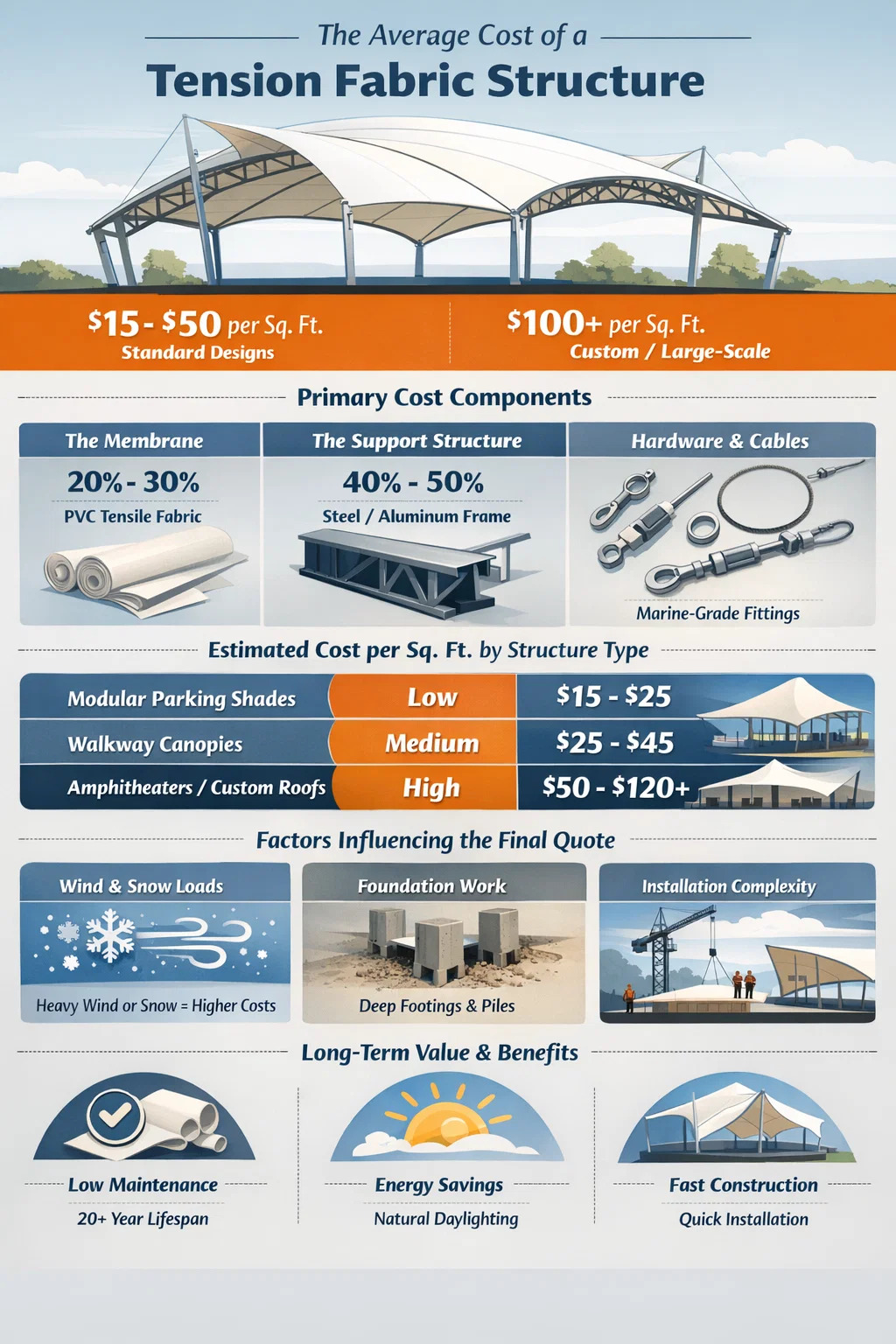 El coste de una estructura de tejido tensado suele oscilar entre $15 a $50 por pie cuadrado para diseños estándar, mientras que los proyectos arquitectónicos altamente personalizados o de gran escala pueden exceder $100 por pie cuadrado . Este precio no es sólo para el Tejido extensible de PVC mismo; abarca un sistema completo que incluye la estructura de acero de ingeniería, hardware especializado, trabajos de cimentación y mano de obra de instalación experta. Debido a que estas estructuras están diseñadas a medida para soportar cargas específicas de viento y nieve, los precios fluctúan según la ubicación geográfica y la complejidad del diseño.