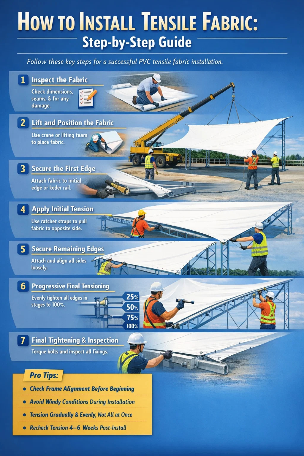 La siguiente secuencia se aplica a la mayoría de las instalaciones de telas tensadas de PVC comerciales y arquitectónicas. Ajuste según el sistema de fijación de bordes específico utilizado: riel keder, abrazadera de placa o canal de cuerda.