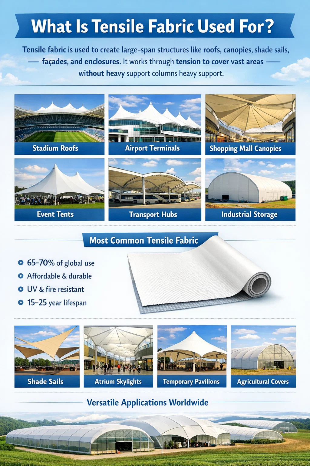 La tela extensible se utiliza para crear estructuras arquitectónicas de gran envergadura (techos, marquesinas, velas de sombra, fachadas y cerramientos) que combinan resistencia estructural con flexibilidad liviana. A diferencia de los materiales rígidos convencionales para techos, la tela extensible funciona distribuyendo la carga mediante tensión en lugar de compresión, lo que significa que puede cubrir áreas enormes sin columnas de soporte pesadas ni marcos gruesos. En la práctica, encontrará tejidos tensados en estadios deportivos, terminales de aeropuertos, marquesinas de centros comerciales, espacios para eventos al aire libre, aparcamientos, parques temáticos e incluso pasarelas de puentes en todo el mundo.